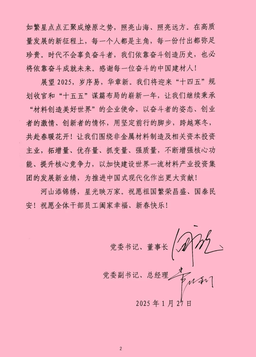 展望2025,,,,,,,岁序易,,,,,,,华章新。。。。。我们将迎来“十四五”妄想收官和“十五五”谋篇结构的崭新一年,,,,,,,让我们继续承继“质料创立优美天下”的企业使命,,,,,,,以斗争者的姿态、创业者的激情、立异者的情怀,,,,,,,用坚定前行的脚步,,,,,,,跨越严冬,,,,,,,共赴春暖花开!让我们围绕非金属质料制造及相关资源投资主业,,,,,,,拓增量、优存量、抓变量、强质量,,,,,,,一直增强焦点功效、提升焦点竞争力,,,,,,,以加速建设天下一流质料工业投资集团的生长新业绩,,,,,,,为推进中国式现代化作出更大孝顺!