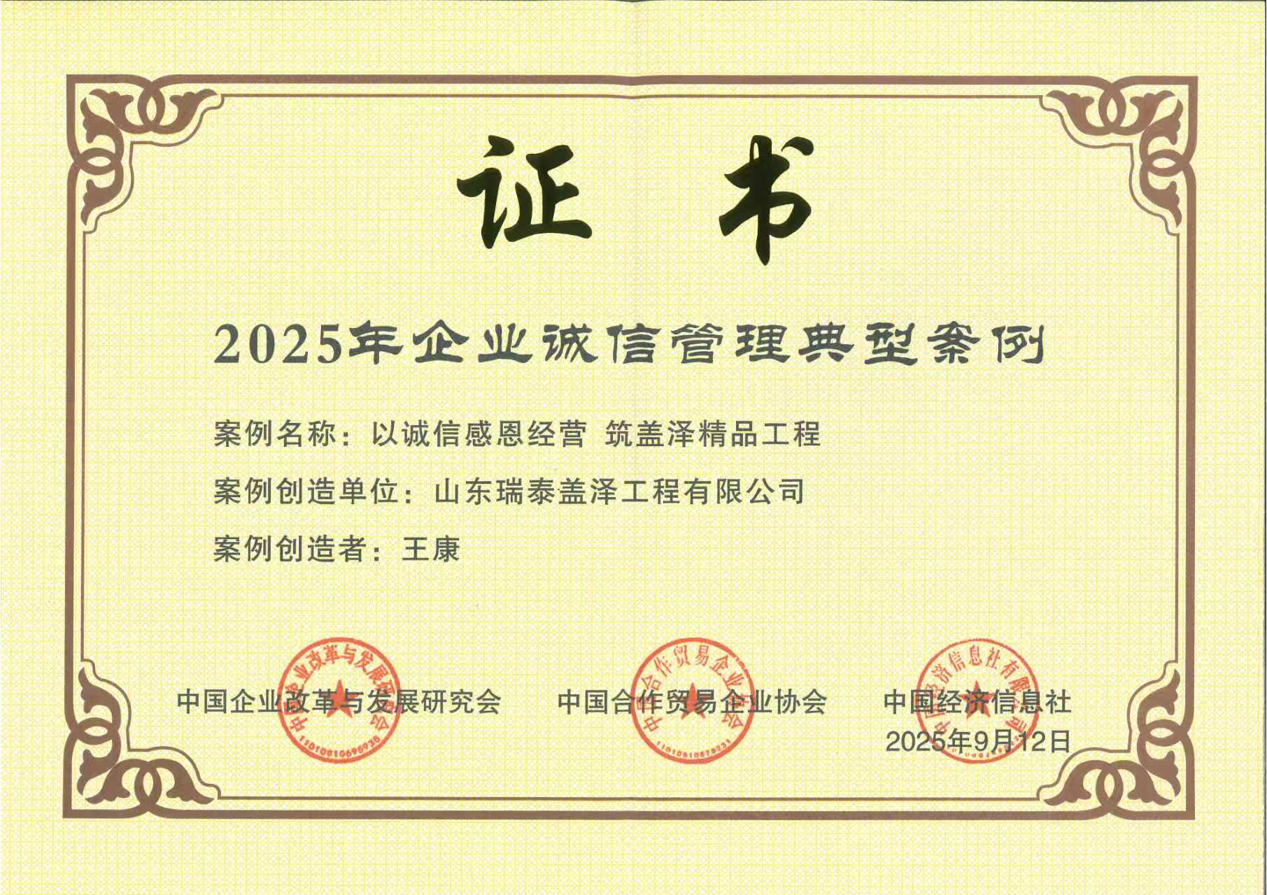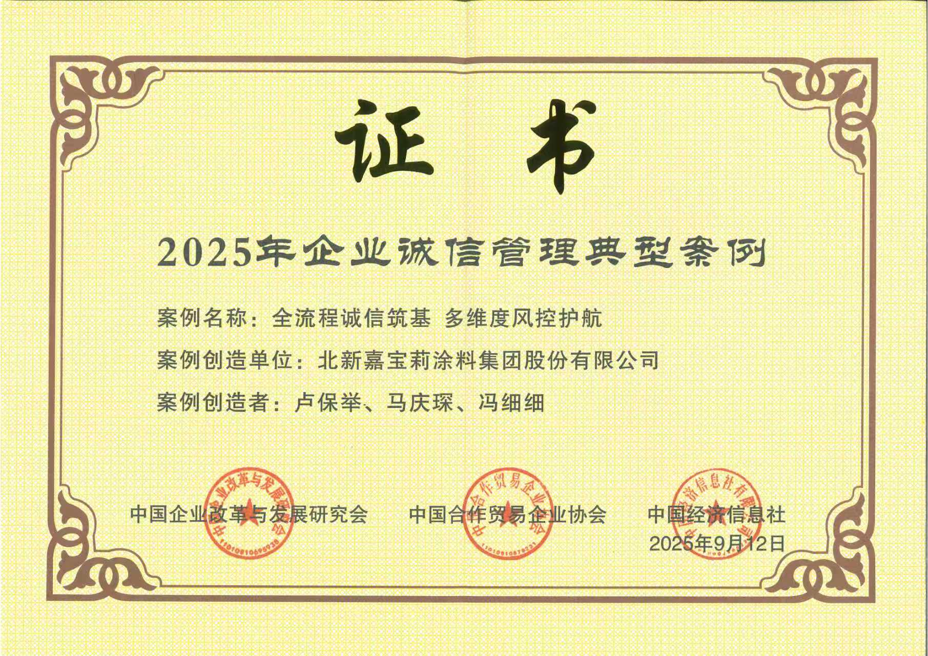 泉源:集团执法合规部 宣布时间:2025-10-099月27日,,,,,,,,中国企业刷新与生长研究会、中国相助商业企业协会主理的“2025年企业诚信建设高质量生长大会”在福州举行。。。。。。。。6686体育 - 流通首播全球篮球足球热门赛事集团入选“2025年培育诚信谋划守信践诺标杆企业建议单位”,,,,,,,,集团所属中材节能股份有限公司、北新嘉宝莉涂料集团股份有限公司、山东瑞泰盖泽工程有限公司的案例荣获“2025年企业诚信治理典范案例”。。。。。。。。
