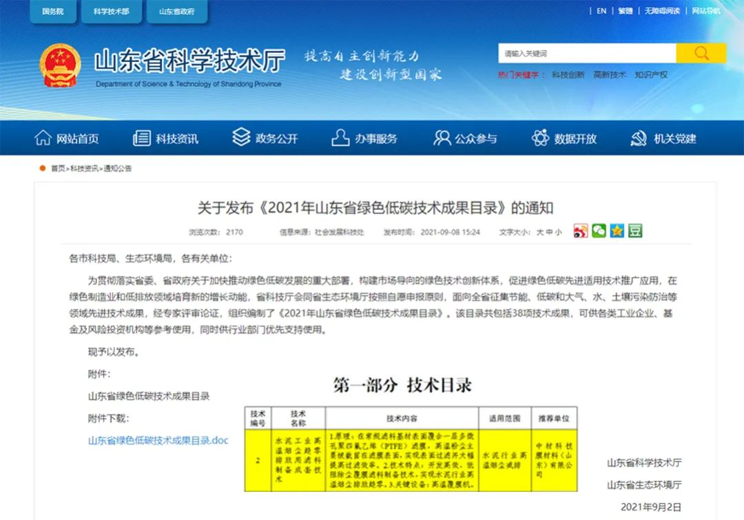 06 ÖвĿƼ¼Ä¤ÖÊÁÏ£¨É½¶«£©ÓÐÏÞ¹«Ë¾¸²Ä¤ÂËÁÏÊÖÒÕÀÖ³ÉÁÐÈë¡¶2021Äêɽ¶«Ê¡ÂÌÉ«µÍ̼ÊÖÒÕЧ¹ûĿ¼¡·