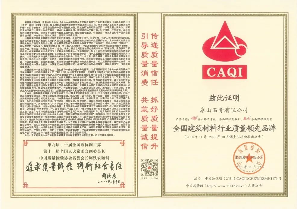 克日,,,,,,,经由多轮的产品抽检和严酷的专家评审,,,,,,,泰山牌石膏板、轻钢龙骨、抹灰石膏以优异的品牌信誉、优质的产品及效劳、普遍的市场认可度,,,,,,,在行业中脱颖而出,,,,,,,被中国质量磨练协会评为“天下修建质料行业质量领先品牌” 。。 。。。。 。产品质量重于泰山,,,,,,,作为石膏板行业中领航者,,,,,,,泰山石膏将继续秉持高标准、高水平、高规格的生产准则,,,,,,,以匠心赢得口碑,,,,,,,以品质取胜市场,,,,,,,强化责任继续,,,,,,,为市场提供越发优质的产品和效劳 。。 。。。。 。