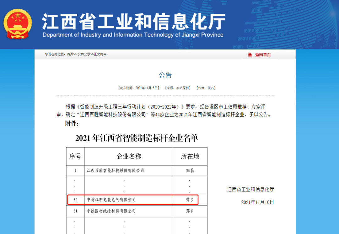 克日,,,,,,,江西省工业和信息化厅宣布了“2021年江西省智能制造标杆企业”名单,,,,,,,中材电瓷荣列其中,,,,,,,这是中材电瓷继2017年入选“江西省智能制造试点树模企业”后又一次获得“智能制造”相关声誉 。。 。。。。 。中材电瓷将鼎力大举施展引领和树模作用,,,,,,,起劲践行习近平总书记关于“立异、协调、绿色、开放、共享”五大生长理念,,,,,,,围绕中国制造2025,,,,,,,加速向数字化、网络化、智能化、绿色化转型升级,,,,,,,一直推动企业高质量生长,,,,,,,全力打造“智能制造5G+工业互联网应用”升级版 。。 。。。。 。