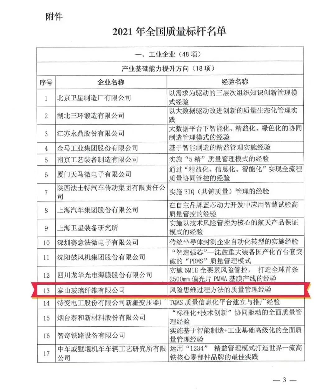 泰山玻纤入选“天下质量标杆”
