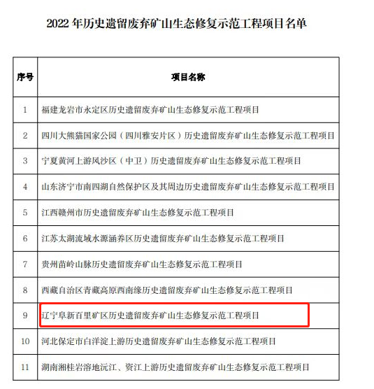 阜新百里矿区历史遗留放弃矿山生态修复树模工程总预算5.16亿元,, ,,,,工程以“绿色屏障、低碳阜新”为目的,, ,,,,通过地形地貌重塑、放弃土地复垦使用、植被恢复等步伐,, ,,,,治理历史遗留放弃矿山2.6万亩,, ,,,,构建 “山青、水碧、林郁、田沃、草绿、沙净”的新生态名堂,, ,,,,为实现“双碳”目的,, ,,,,维护国家生态清静做出新孝顺,, ,,,,为辽宁总队在山水林田湖草沙、历史遗留矿山、双碳等领域营业拓展涤讪坚实基础。。。。。。