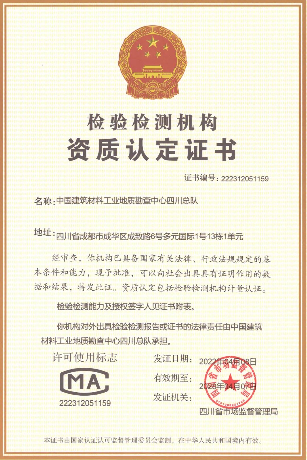 四川总队磨练检测机构资质认定证书