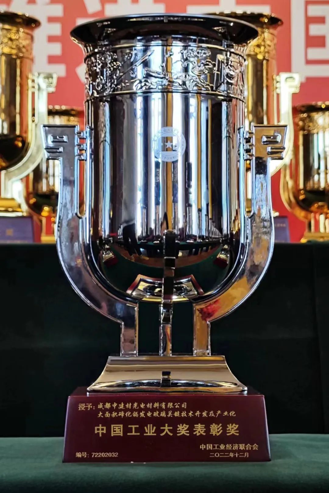 “大面积碲化镉发电玻璃要害手艺开发”项目,,,,,,,,荣获第七届“中国工业大奖”表扬奖,,,,,,,,成为玻璃领域唯一获奖项目。。。。。。