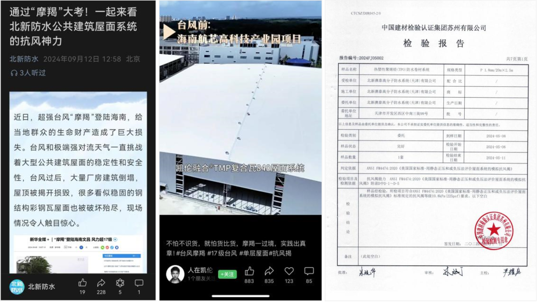 国检集团苏州公司恒久致力于修建屋面系统清静领域检测效劳,,,,,通过苏州公司抗风揭测试的北新澳泰高分子防水系统(天津)有限公司等企业的产品经受住“摩羯”磨练,,,,,风灾事后依旧坚持着较为完整的功效性。。。。。。。