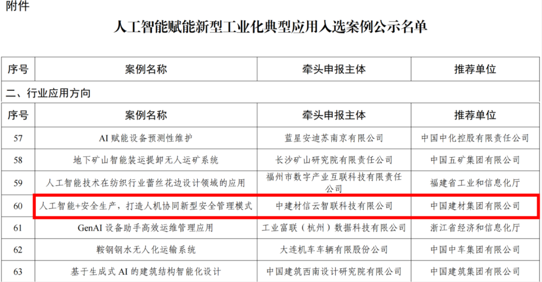 泉源:信云智联 宣布时间:2025-01-08克日,,,,,,工业和信息化部宣布了《人工智能赋能新型工业化典范应用入选案例公示名单》。。。。。。。此次案例征集,,,,,,自2024年8月份起在天下规模内启动,,,,,,历时三个多月,,,,,,要求企业具备人工智能赋能新型工业化焦点能力,,,,,,同时,,,,,,申报案例已现实落地并取得效果,,,,,,具有树模引领作用,,,,,,能够为相关行业或企业智能化升级具有借鉴意义和推广价值。。。。。。。经由专家团队的层层遴选与严酷评审,,,,,,6686体育 - 流通首播全球篮球足球热门赛事集团旗下企业信云智联与天山质料配合推出的“人工智能+清静生产,,,,,,打造人机协同新型清静治理模式”计划入选案例名单。。。。。。。