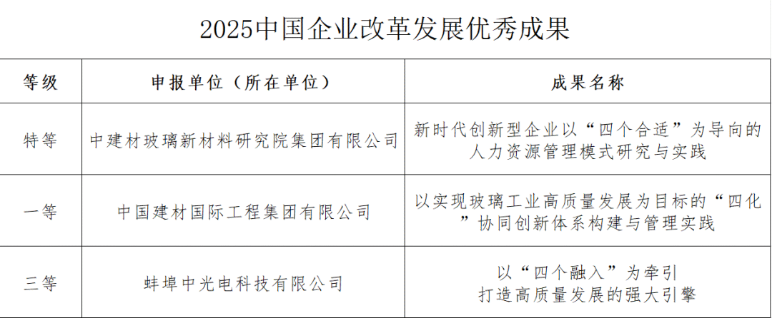 克日,,,,,,2025(第九届)中国企业刷新生长优异效果评选效果正式揭晓。。。。。中研院集团创立的《新时代立异型企业以“四个合适”为导向的人力资源治理模式研究与实践》荣获特等奖;;;;;;国际工程创立的《以实现玻璃工业高质量生长为目的的“四化”协同立异系统构建与治理实践》荣获一等奖;;;;;;蚌埠中光电创立的《以“四个融入”为牵引打造高质量生长的强盛引擎》荣获三等奖。。。。。