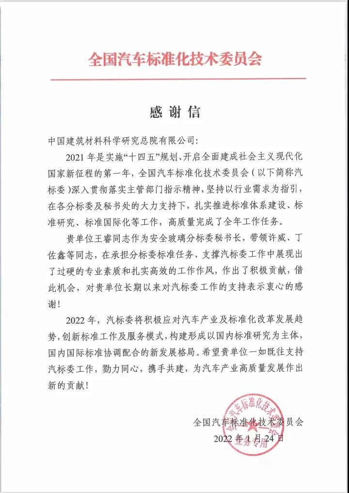克日,,,,,,,天下汽车标准化手艺委员会发来谢谢信,,,,,,,对国检集团在肩负天下汽车标准化手艺委员会事情中做出的起劲孝顺予以谢谢和表扬,,,,,,,对国检集团玻璃磨练认证院王睿、许威、丁佐鑫等优异小我私家在支持全标委事情中展现出过硬的专业素质和扎实高效的事情作风予以表扬。。。。。。