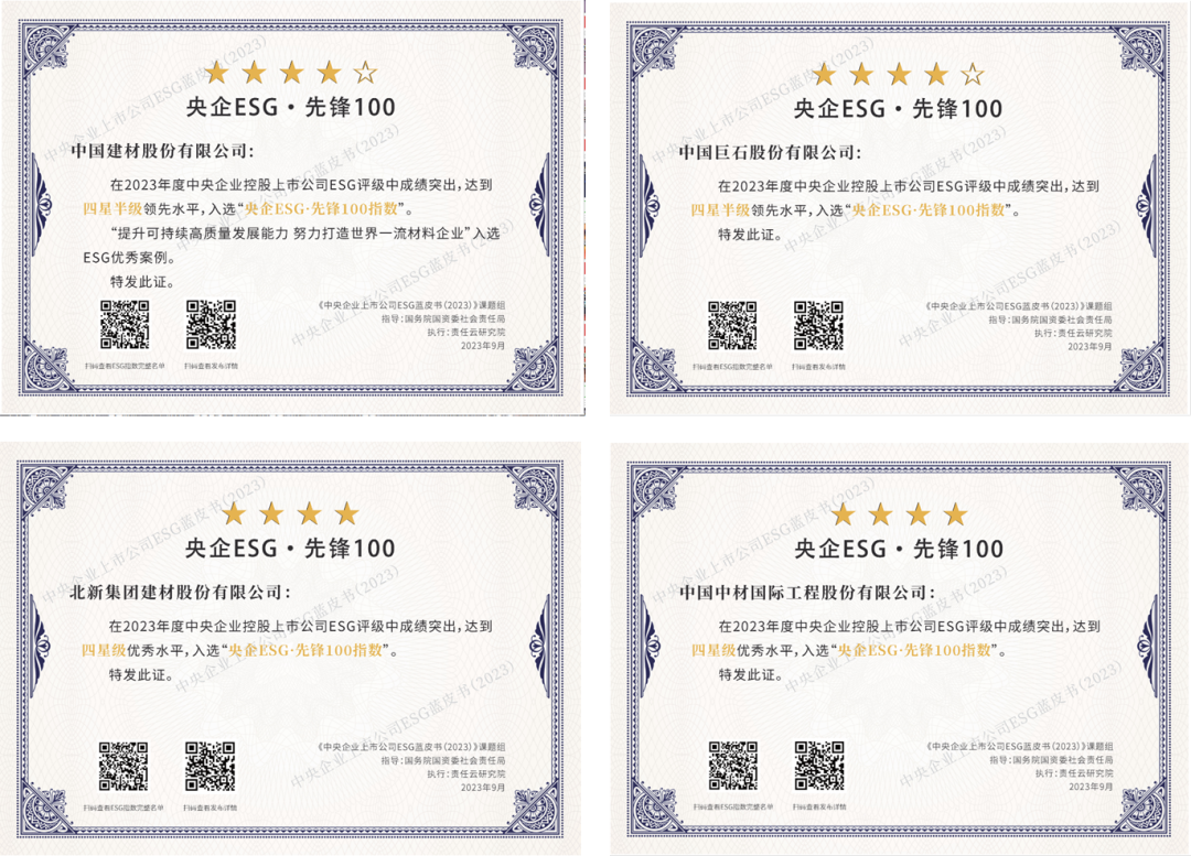 克日,,,,,,,《中央企业上市公司ESG蓝皮书(2023)》及“央企ESG·先锋100指数”榜单宣布。。。。。。集团所属4家上市公司6686体育 - 流通首播全球篮球足球热门赛事股份、中国巨石、北新6686体育 - 流畅首播全球篮球足球热门赛事和中材国际入选了“央企ESG·先锋100指数”,,,,,,,划分位于第33位,,,,,,,第39位,,,,,,,第87位以及第92位。。。。。。ESG体现均处于四星级水平以上,,,,,,,是上市公司ESG生长的领先者。。。。。。6686体育 - 流通首播全球篮球足球热门赛事股份案例《提升可一连高质量生长能力 起劲打造天下一流质料企业》入选了《中央企业上市公司ESG蓝皮书(2023)》。。。。。。